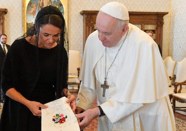 Pápež prijal maďarskú hlavu štátu s manželom a sprievodom o desiatej predpoludním v Sále bibliotéky a zotrval s ňou v 45-minútovom rozhovore. Maďarská prezidentka sa následne v priestoroch Štátneho sekretariátu stretla so štátnym sekretárom kardinálom Pietrom Parolinom spolu s arcibiskupom Paulom Richardom Gallagherom, sekretárom pre vzťahy so štátmi a medzinárodnými organizáciami. O obsahu stretnutia informuje oficiálne komuniké: