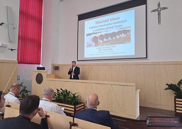 V prvej časti konferencie vystúpili hostia zo Slovenska. Sr. Marta Andraščíková, ktorá sa venuje terapeutickému sprevádzaniu obetí, na základe osobných skúseností priblížila prežívanie obetí sexuálneho zneužívania v rôznych oblastiach ich života. V závere jej prednášky povedala svoje svedectvo jedna z obetí zo Slovenska. Mons. Marek Forgáč, košický pomocný biskup a predseda Komisie KBS pre ochranu maloletých v Cirkvi vo svojej prednáške o telesnosti kňaza ozrejmil súvislosť medzi deliktami sexuálneho zneužívania v Cirkvi a celibátnym spôsobom života. Andrej Kačmár, riaditeľ Centra na ochranu maloletých v Košiciach, vo svojej prezentácii porovnal existujúce smernice o riešení prípadov sexuálneho zneužívania v Česku, Nemecku, Taliansku a na Slovensku.