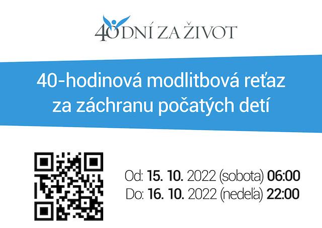 Bratislava 13. októbra (TK KBS) V rámci jesennej kampane 40 dní za život sa počas víkendu uskutoční 40 hodinová reťaz za záchranu počatých detí. Reťaz bude prebiehať od soboty 15. októbra od 6:00 až do nedele 16. októbra do 22:00.