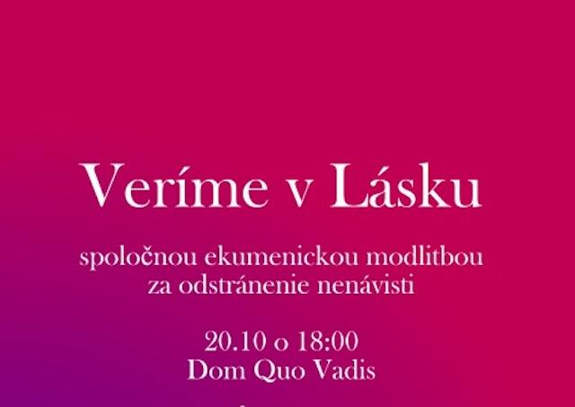Bratislava 20. októbra (TK KBS) Veríme v lásku - v duchu tejto myšlienky bude dnes od 18:00 do 19:00 v Dome Quo Vadis v Bratislave ekumenická modlitba za odstránenenie nenávisti. Povedie ju katolícky kňaz Jozef Pajerský a evanjelický farár Ivan Lukáč. V programe budú hudobné a modlitbové vstupy a modlitba Otče náš za obete násilia.
