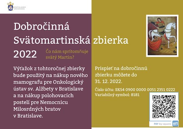Bratislava 14. novembra (TK KBS) Do Dobročinnej Svätomartinskej zbierky sa dá zapojiť až do konca roka. Avizuje to Bratislavská arcidiecéza. Ide o tradičnú zbierku v arcidiecéze, ktorá sa koná každoročne pri príležitosti slávnosti patróna arcidiecézy sv. Martina.
