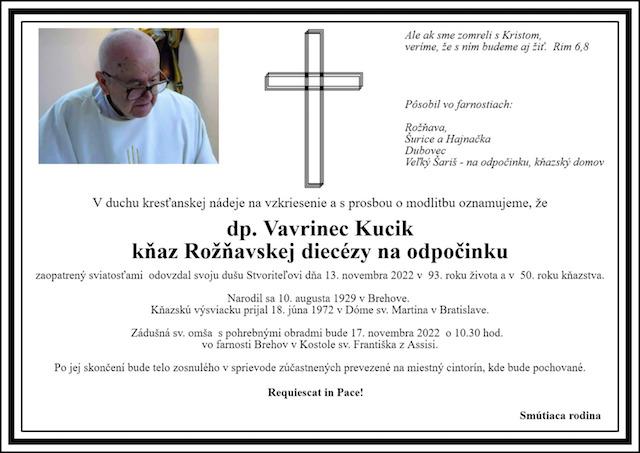 Rožňava 15. novembra (TK KBS) V 93. roku života a v 50. roku kňazstva zomrel kňaz Rožňavskej diecézy na odpočinku Vavrinec Kucik. Zádušná svätá omša s pohrebnými obradmi bude vo štvrtok 17. novembra 2022 o 10:30 vo farnosti Brehov v Kostole sv. Františka z Assisi. Po jej skončení bude telo zosnulého v sprievode prítomných prevezené na miestny cintorín, kde bude pochované.
