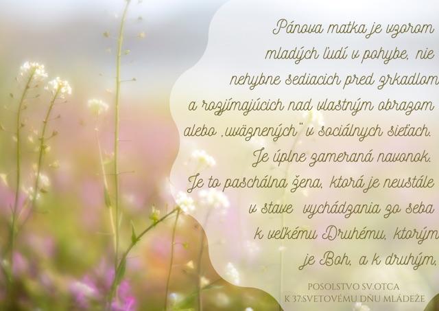 Bratislava 15. novembra (TK KBS) K Svetovému dňu mládeže, ktoré oslávime na konci týždňa - počas slávnosti Nedele Krista Kráľa - vytvorili sestry z Kongregácie sestier Božského Vykupiteľa originálne myšlienky na zdieľanie na sociálnych sieťach. Pochádzajú z posolstva pápeža Františka k tomuto dňu.