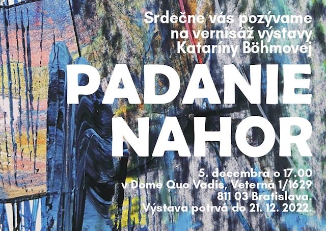 Bratislava 30. novembra (TK KBS) V Dome Quo Vadis otvoria výstavu obrazov akademickej maliarky Kataríny Böhmovej Padanie nahor. Vernisáž sa uskutoční v pondelok 5. decembra 2022 o 17:00. Výstava bude verejnosti prístupná do 21. decembra 2022.