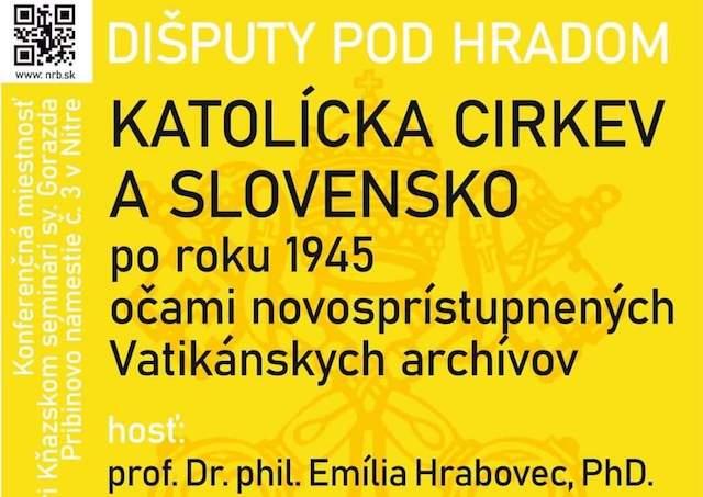 Nitra 4. decembra (TK KBS) Nitrianske biskupstvo a Kňazský seminár sv. Gorazda v Nitre pozývajú záujemcov na ďalší diskusný večer pod názvom Dišputy pod hradom. Hosťom večera bude historička prof. Emília Hrabovec. V diskusii budú diskutovať na tému Katolícka cirkev a Slovensko po roku 1945 očami novosprístupnených Vatikánskych archívov.