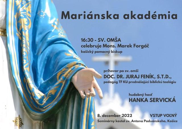 Bratislava 7. decembra (TK KBS) Vo štvrtok 8. decembra bude prikázaný sviatok - Slávnosť Nepoškvrneného počatia Preblahoslavenej Panny Márie. V Seminárnom kostole sv. Antona Paduánskeho v Košiciach sa pri tejto príležitosti uskutoční Mariánska akadémia. Vstup je voľný.
