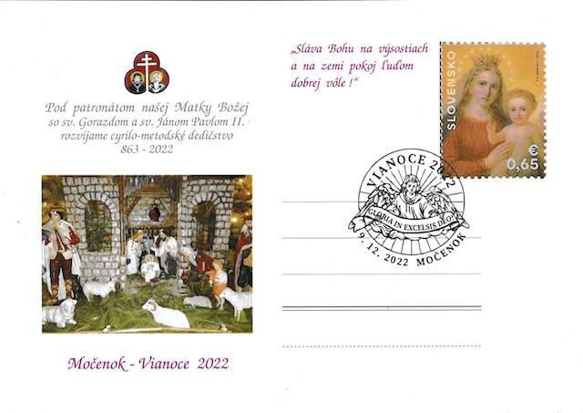 Močenok 9. decembra (TK KBS) K blížiacim sa sviatkom narodenia Ježiša Krista vydal Klub filatelistov 52 - 46 Močenok spolu s Farnosťou sv. Klimenta Močenok príležitostnú poštovú pečiatku a lístok, ktoré budú dostupné na pošte v Močenku od 9. do 19. decembra 2022, informoval Jozef Kútny z Klubu filatelistov 52-46 Močenok.