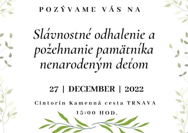 Trnava 14. decembra TK KBS) Občianske združenie Naše MesTTo o.z. informuje, že po viac ako dvoch rokoch príprav a niekoľko mesačnej postupnej realizácii stavebných prác, sa v utorok 27. decembra 2022 o 15:00 uskutoční slávnostné odhalenie a požehnanie pamätníka nenarodeným deťom na cintoríne na Kamennej ceste v Trnave.