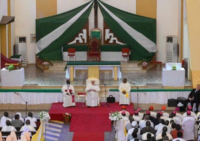 Túžil som sa s vami stretnúť, a dnes chcem Pánovi poďakovať za toto stretnutie. Ďakujem biskupovi Mons. Tombemu Trillemu za jeho pozdrav a vám všetkým, za vašu prítomnosť, a som vďačný aj za vaše pozdravy. Niektorí z vás precestovali celé dni, aby tu dnes mohli byť!