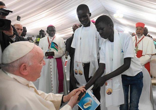 Svätý Otec si spolu s arcibiskupom Canterbury Justinom Welbym a moderátorom Generálneho zhromaždenia Škótskej cirkvi Iainom Greenshieldsom, s ktorými prišiel do Južného Sudánu na ekumenickú púť pokoja, vypočul svedectvá troch detí žijúcich v utečeneckých táboroch. Vo svojom príhovore vyzval: