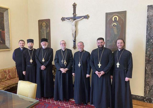 Rím 13. februára (TK KBS) Prefekt Dikastéria pre Východné cirkvi Mons. Claudio Gugerotti, prijal v pondelok v Ríme slovenských gréckokatolíckych biskupov. Tí prišli do Ríma, aby pozdravili nového prefekta, ktorý prevzal svoj úrad 16. januára tohto roka. Vladykovia poďakovali Mons. Gugerottimu za menovanie vladyku Milana Lacha SJ za pomocného biskupa do Bratislavy. Zároveň ho informovali o aktuálnej situácii Gréckokatolíckej cirkvi na Slovensku. V závere stretnutia odovzdali novému prefektovi v mene všetkých gréckokatolíkov na Slovensku dar - panagiu - biskupský medailón s vyobrazením presvätej Bohorodičky z Klokočova.