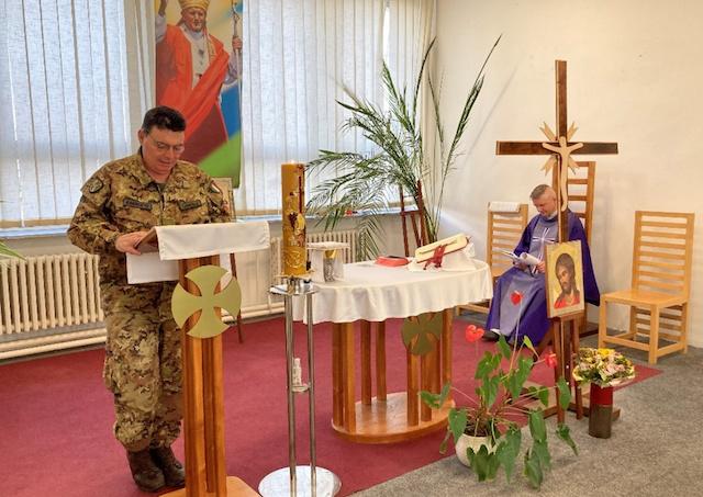 Kuchyňa 27. februára (TK KBS) Vo vojenskej kaplnke sv. Jána Pavla II., ktorá sa nachádza v priestoroch 46. krídla Kuchyňa, slúžia sväté omše v anglickom jazyku. Určené sú pre prichádzajúcich koaličných vojakov z Talianska. Od prvej pôstnej nedele 26. februára 2023 sa tieto bohoslužby konajú s čítaniami a niektorými krátkymi liturgickými výzvami aj v talianskom jazyku.