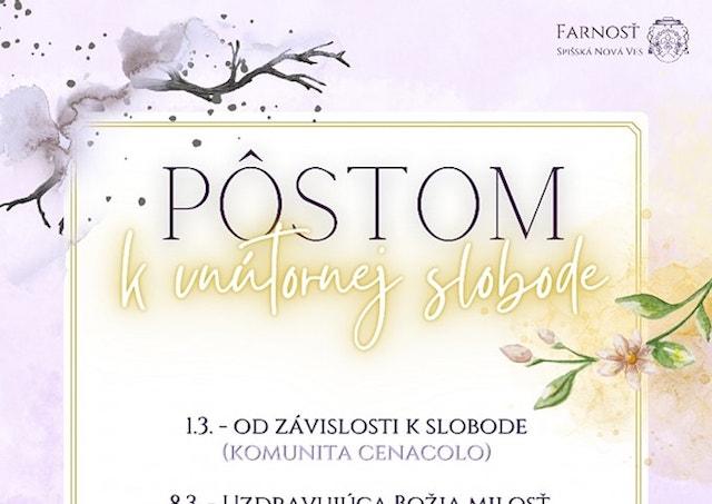 Spišská Nová Ves 28. februára (TK KBS) Farnosť Spišská Nová Ves pozýva na pôstnu obnovu Pôstom k vnútornej slobode. „Prednášky spolu so svätou omšou či adoráciou, sa budú konať v kine Mier každú stredu o 17:00. Pozývame Vás všetkých objaviť krásy vnútornej slobody človeka a priblížiť sa viac k Bohu,“ avizuje farnosť.
