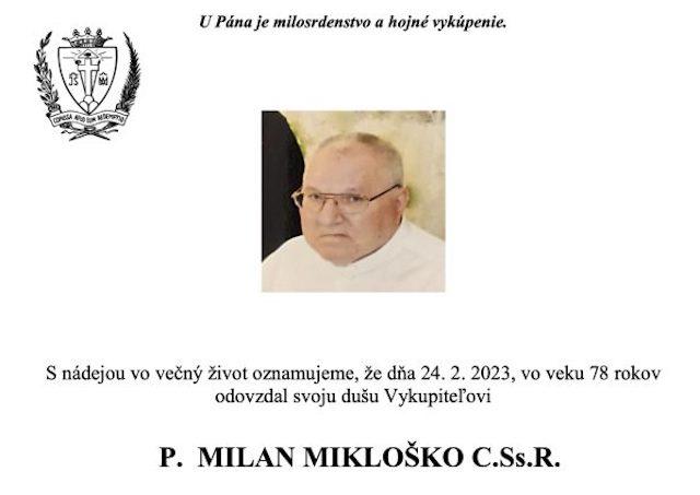 Bratislava 28. februára (TK KBS) V piatok 24. februára 2023 zomrel vo veku 78 rokov redemptorista P. Milan Mikloško, C.Ss.R. Zo zosnulým kňazom sa rozlúčia v sobotu 4. marca 2023 o 11:00 svätou omšou v kostole sv. Stanislava v Podolínci. Jeho pozostatky budú uložené potom na cintoríne v Podolínci.