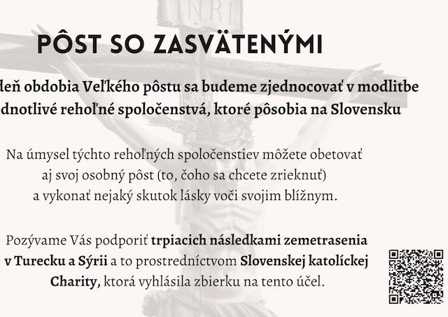 „Obdobie pôstu je pre kresťanov dobrým časom na prehĺbenie osobnej modlitby, ale rovnako aj časom, kedy svoje modlitby môžeme obetovať na úmysel druhých. K modlitbe pozýva aj sv. Vincent Pallotti, zakladateľ Združenia katolíckeho apoštolátu: „Modli sa a povzbudzuj do modlitby druhých...“ Nasledujúc slová zakladateľa si Združenie katolíckeho apoštolátu pripravilo na práve prebiehajúce obdobie pôstu modlitebnú aktivitu pod názvom Pôst so zasvätenými, v rámci ktorej pozýva veriacich k modlitbe za rehole, ktoré pôsobia na Slovensku,“ informovala Silvia Pavlíková.
