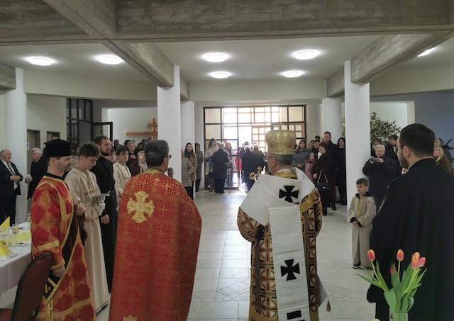 Po zaambónnej modlitbe vladyka Cyril posvätil nový svietnik na obetné sviece, ktorý pribudol z iniciatívy miestneho ružencového spoločenstva. Pred tým, ako sa liturgický sprievod odobral na posviacku dolných pastoračných priestorov chrámu, sa slova ujal duchovný otec Jozef.