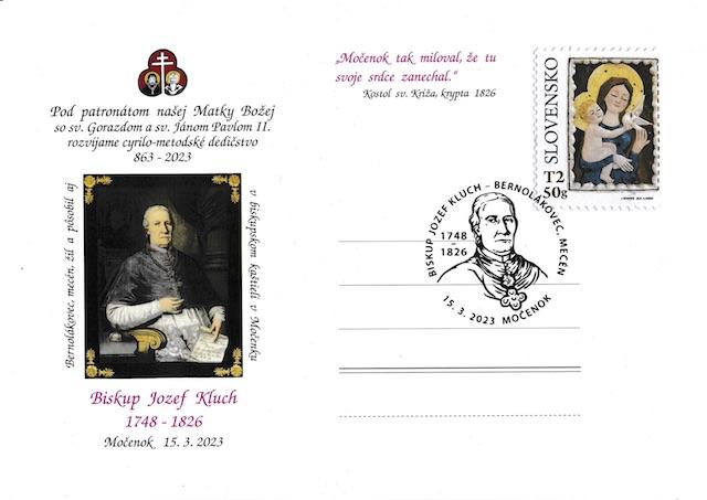 Močenok 14. marca (TK KBS) Pri príležitosti 275. výročia narodenia nitrianskeho biskupa Jozefa Klucha vydal Klub filatelistov 52 - 46 Močenok spolu s Rímskokatolíckou farnosťou sv. Klimenta a Obcou Močenok príležitostnú poštovú pečiatku a lístok, ktoré budú od 15. do 23. marca 2023 na pošte v Močenku.