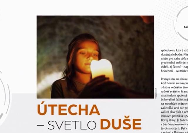 Pápež František v cykle katechéz rozpráva o duchovnej úteche – hlbokej skúsenosti vnútornej radosti, ktorá umožňuje vidieť Božiu prítomnosť vo všetkých veciach; posilňuje vieru a nádej, ako aj schopnosť konať dobro. Nie je nápadná, ale jemná, delikátna, ako kvapka vody vnikajúca do špongie.