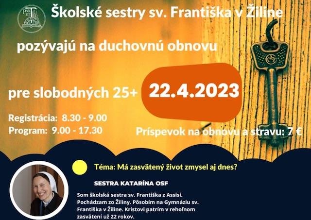 Žilina 23. marca (TK KBS) Školské sestry sv. Františka v Žiline pozývajú na jednodňovú duchovnú obnovu pre slobodných mužov a ženy 25+. „Príďte, čaká vás prednáška sestry Kataríny OSF na tému Má zasvätený život zmysel aj dnes?, prednáška brata Miloša OFMCap na tému Základné podmienky pre rozlišovanie povolania a podmienky pre prijatie do zasväteného života, modlitba chvál a stretnutie a rozhovory s novými ľuďmi. Zároveň sa dozviete niečo viac, ako žijú a čím žijú rehoľníci a niečo viac o sebe a o kráčaní s Bohom," avizujú organizátori.