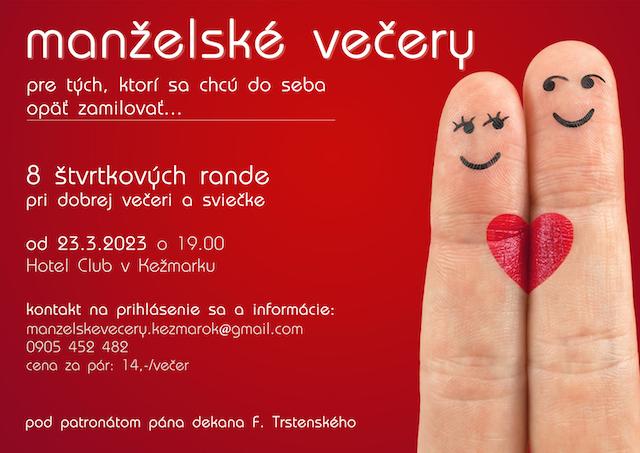 Kežmarok 23. marca (TK KBS) Vo farnosti Kežmarok sa rozhodli ponúknuť manželom posilnenie ich vzťahov prostredníctvom kurzu „Manželské večery.“ Tvorí ho osem stretnutí. Zámerom kurzu je pomôcť všetkým manželským párom prehĺbiť ich partnerský vzťah. Kurz dáva manželom výbornú príležitosť stráviť čas spolu ako pár a pritom sa zaoberať dôležitými otázkami svojho manželstva.