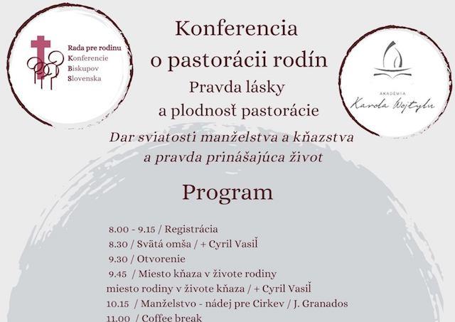 Jej hosťom bude prof. José Granados zo Španielska, generálny predstavený rehole Učeníkov Sŕdc Ježiša a Márie, ktorý prednesie dve témy: Manželstvo - nádej pre Cirkev a Kňazstvo - dar otcovstva pre rodiny. Súčasťou programu bude aj diskusia s hosťom, burza noviniek v pastorácii rodín, diskusné skupiny.