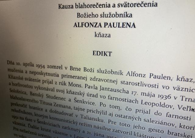 Bratislava 13. apríla (TK KBS) Pri príležitosti otvorenia diecéznej fázy procesu blahorečenia a svätorečenia kňaza Alfonza Paulena vydal bratislavský arcibiskup metropolita Mons. Stanislav Zvolenský edikt (plné znenie je TU) s pozvaním oznámiť na Arcibiskupský úrad v Bratislave všetky informácie, ktoré môžu byť prospešné alebo naopak, vo veci povesti svätosti a povesti mučeníctva Božieho služobníka Alfonza Paulena.