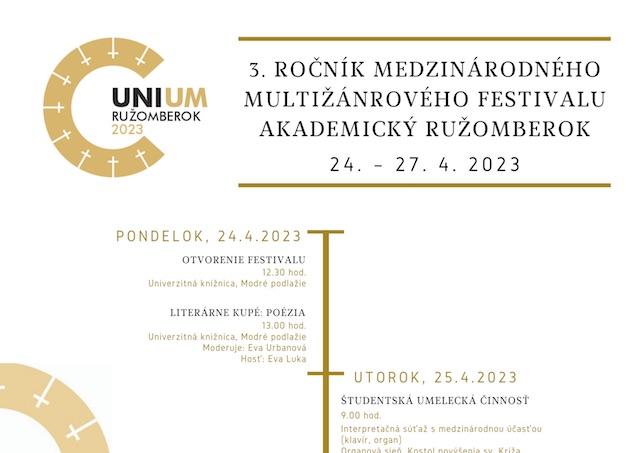 Ružomberok 17. apríla (TK KBS) Katolícka univerzita v Ružomberku chystá v dňoch 24. - 27. apríla 2023 Medzinárodný multižánrový festival Akademický Ružomberok - UNIUM 2023.
