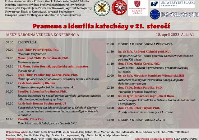 Prešov 17. apríla (TK KBS) Gréckokatolícka teologická fakulta Prešovskej univerzity v Prešove v spolupráci s Diecéznym katechetickým strediskom Prešovskej archieparchie a Univerzitou Jána Pavla II. v Krakove organizuje medzinárodnú vedeckú konferenciu s názvom Pramene a identita katechézy v 21. storočí, ktorá sa uskutoční v utorok 18. apríla v priestoroch fakulty so začiatkom o 9:00. Konferencia je súčasťou projektu KEGA 025PU-4/2023, zaoberajúceho sa inováciou študijného programu animácia voľného času, do ktorého bezprostredne patrí aj služba evanjelizácie a katechizácie.