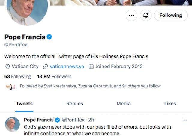 Vatikán 20. apríla (VaticanNews) „Boží pohľad sa nikdy nezastavuje pri našej minulosti plnej chýb, ale s nekonečnou dôverou hľadí na to, čím sa môžeme stať.“ Odkaz tohto znenia rozoslal cez sociálnu sieť Twitter pápež František vo štvrtok 20. apríla.
