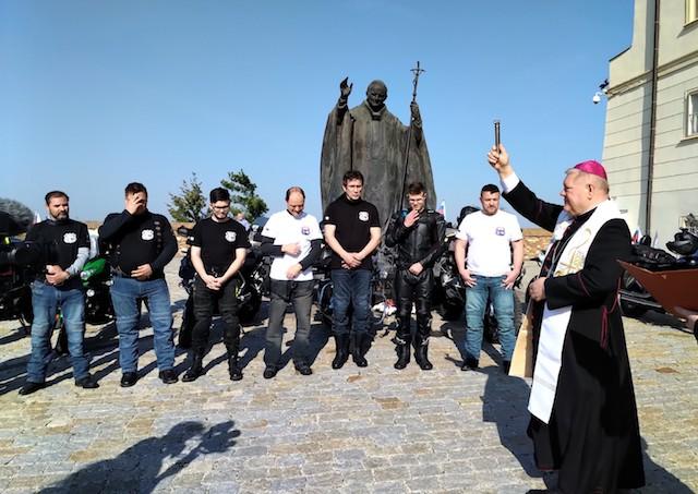 Nitra 24. apríla (TK KBS) Ťažké cestné motorky s burácajúcimi motormi a jazdcami v kožených odevoch zaparkovali v Nitre v sobotu 22. apríla 2023 pred sochou sv. Jána Pavla II. na hornom nádvorí Nitrianskeho hradu, aby si prišli po požehnanie od nitrianskeho biskupa Mons. Viliama Judáka pred motopúťou do gréckeho Solúna.
