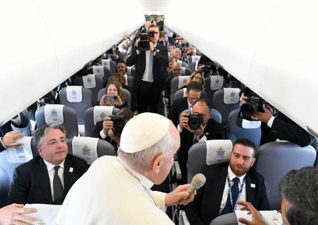 Pápež postupne pozdravil novinárov, podal im ruku a vymenil si s nimi niekoľko slov či anekdot. Predovšetkým korešpondent poľskej tlačovej agentúry PAP mu poďakoval za obhajobu Jána Pavla II., teda za slová, ktoré povedal 16. marca počas mariánskej modlitby Raduj sa nebies Kráľovná v súvislosti s výrokmi útočiacimi na údajné zvyky poľského pápeža, ktorý mal večer opustiť Vatikán, „nie však kvôli požehnávaniu domácností“. Sú to „urážlivé a nepodložené závery“, povedal vtedy pápež František z okna Apoštolského paláca, a dnes počas svojho letu do Maďarska dodal: „Sú to nezmysly".
