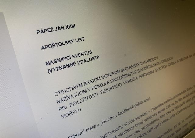 Bratislava 11. mája (TK KBS) Konferencia biskupov Slovenska prináša na internetovej stránke www.kbs.sk preklad apoštolského listu svätého pápeža Jána XXIII. Magnifici eventus (Významné udalosti). Od jeho vydania dnes uplynulo 60 rokov. List bol vydaný vo Vatikáne 11. mája 1963, pri príležitosti tisícstého výročia príchodu svätých Cyrila a Metoda na Veľkú Moravu.