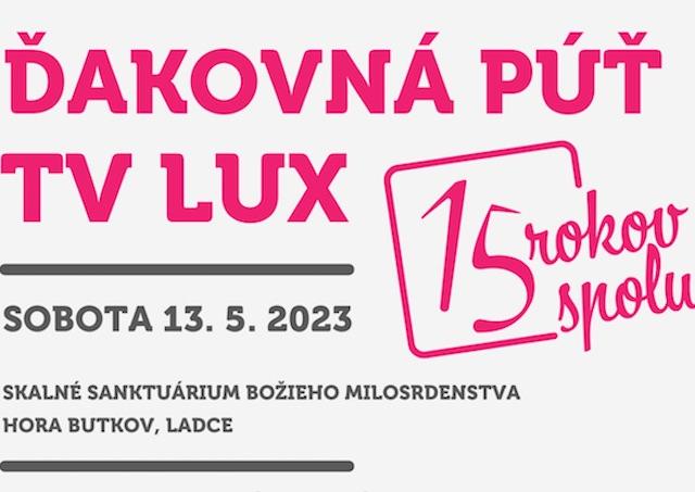 Bratislava 12. mája (TK KBS) Televízia LUX pozýva na ďakovnú púť za 15 rokov svojho vysielania. „Príďte v sobotu 13. mája 2023 na horu Butkov vo farnosti Ladce, kde sa budeme môcť osobne stretnúť a spoločne sa modliť a ďakovať Bohu, ale i vám, našim divákom za priazeň a podporu," pozýva TV LUX.