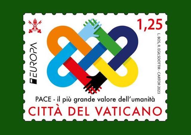 Obe známky venované mieru sú súčasťou série Vatikánskeho filatelistického úradu „Európa 2023“. Známka v hodnote 0,10 € zobrazuje pápeža Františka počas generálnej audiencie 6. apríla 2022, kedy mu bola odovzdaná ukrajinská vlajka pochádzajúca z mesta Buča, kde došlo k desivej masakre. Pápež František pri tejto príležitosti, rovnako ako pri mnohých ďalších príležitostiach od vypuknutia útočnej vojny, prosil za mier pre Ukrajinu a za to, aby sa na tamojšiu vojnu a utrpenie ľudí nezabúdalo a aby sa za nich ľudia modlili.