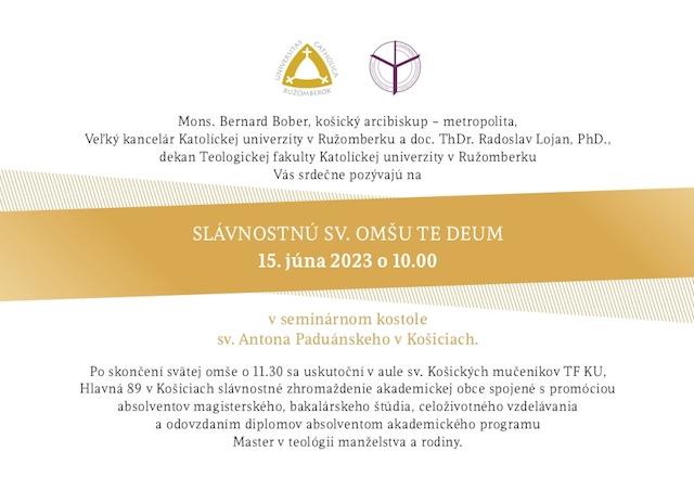 Košice 13. júna (TK KBS) Košický arcibiskup metropolita a veľký kancelár Katolíckej univerzity (KU) v Ružomberku Mons. Bernard Bober, dekan Teologickej fakulty (TF) KU doc. Radoslav Lojan a rektor Kňazského seminára v Košiciach Štefan Novotný pozývajú zamestnancov a študentov fakulty, seminára a pastoračného centra na Te Deum. Uskutoční sa vo štvrtok 15. júna 2023 o 10:00 v seminárnom kostole sv. Antona Paduánskeho v Košiciach.