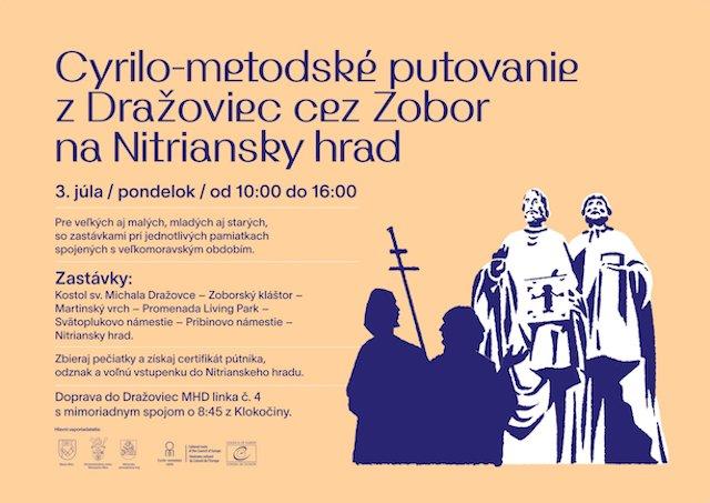 Nitra 13. júna (TK KBS) V rámci programu cyrilo-metodských slávností Nitra, milá Nitra 2023 Biskupstvo Nitra pozýva veľkých aj malých, mladých aj starých v pondelok 3. júla 2023 na nenáročné turisticko-pútnické podujatie so zastávkami pri pamiatkach spojených s veľkomoravským obdobím, spojené so zbieraním pečiatok do pútnických pasov, na základe ktorých na záver putovania na Nitrianskom hrade dostane každý pútnik certifikát o absolvovaní cesty, odznak a voľnú vstupenku do areálu Nitrianskeho hradu.