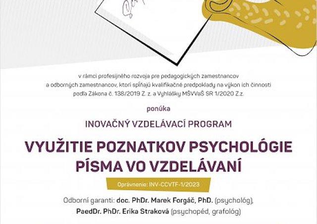 Garantmi sú košický pomocný biskup Mons. Marek Forgáč a psychologička Erika Straková. Inovačné vzdelávanie je zamerané na rozvoj profesijných komptencií oblasti psychológie písma psychodiagnostiky a liečebnej pedagogiky. Prihlášky je potrebné podať do 30. novembra 2023. Bližšie informácie je možné nájsť na stránke TF KU.