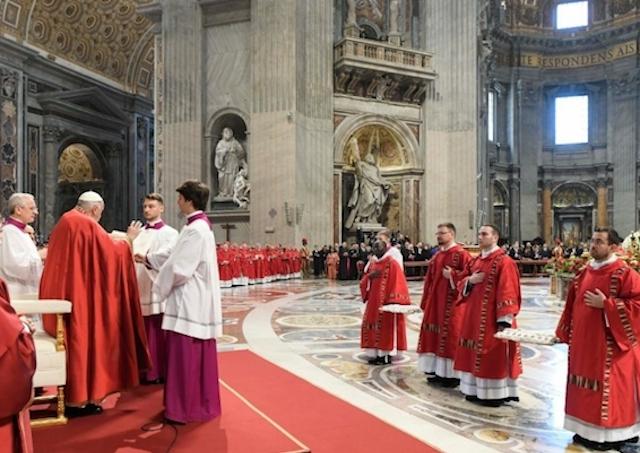 Bratia a sestry, oslavujme Petra a Pavla. Oni odpovedali na základnú otázku života - kto je pre mňa Ježiš? - tým, že žili nasledovanie a ohlasovali evanjelium. Je krásne, ak rastieme ako Cirkev nasledovania, ako pokorná Cirkev, ktorá nikdy nepovažuje hľadanie Pána za samozrejmosť. Je krásne, ak sa staneme Cirkvou, ktorá vychádza von, ktorá nenachádza svoju radosť vo veciach sveta, ale v ohlasovaní evanjelia svetu, aby sme zasiali otázku o Bohu do sŕdc ľudí. Prinášať Pána Ježiša všade, s pokorou a radosťou: v našom meste Ríme, v našich rodinách, vo vzťahoch a susedstvách, v občianskej spoločnosti, v Cirkvi, v politike, v celom svete, najmä tam, kde číha chudoba, znevažovanie a opovrhovanie.