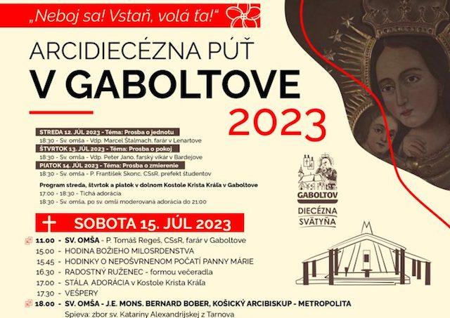 Gaboltov 13. júla (TK KBS) Gaboltov privíta Arcidiecéznu púť Košickej arcidiecézy (15. - 16. júla 2023). Nedeľnú svätú omšu bude celebrovať nitriansky pomocný biskup Mons. Peter Beňo. Naživo ju prinesie RTVS.