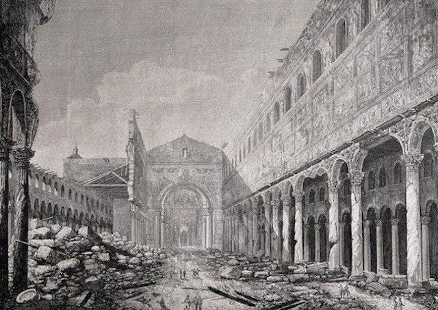 Medzitým sa mnohí Rimania tlačili a s hrôzou sledovali, ako sa odohráva hrozné divadlo. Jeden z veľkých chrámov kresťanstva, ktorý v roku 324 posvätil Silvester I., takmer zanikol. Na miesto prišlo aj niekoľko umelcov, aby na svojich plátnach zachytili fragmenty skazy, ktoré nám dnes pomáhajú pochopiť jej rozsah a emocionálny dopad. „Osudná hanba,“ ako čítame v dobovom periodiku Diario di Roma, alebo „strašný Vezuv,“ ako ju definoval Giuseppe Marocchi, je obrovská tragédia, o ktorej sa čoskoro dozvedel celý Rím, paradoxne okrem pápeža.