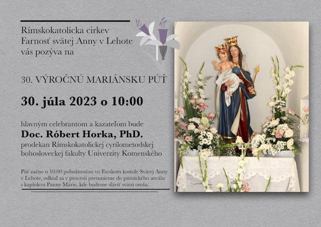 Lehota 21. júna (TK KBS) Farnosť svätej Anny v Lehote pozýva na 30. výročnú mariánsku púť, ktorá bude 30. júla 2023. Hlavným celebrantom a slávnostným kazateľom bude Róbert Horka, prodekan Rímskokatolíckej cyrilometodskej bohosloveckej fakulty Univerzity Komenského v Bratislave.
