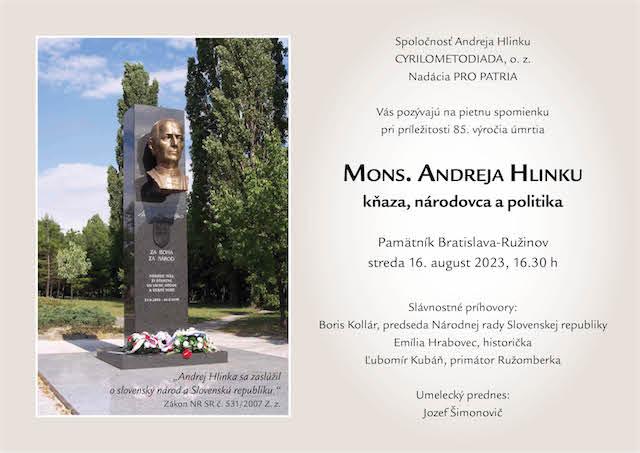 Bratislava 9. augusta (TK KBS) Spoločnosť Andreja Hlinku, CYRILOMETODIADA, o. z., a Nadácia PRO PATRIA pozývajú na uctenie si pamiatky otca slovenského národa Mons. Andreja Hlinku pri príležitosti 85. výročia jeho úmrtia. Spomienka bude 16. augusta 2023 o 16:30 pri pamätníku Andreja Hlinku v Parku Andreja Hlinku v bratislavskom Ružinove.