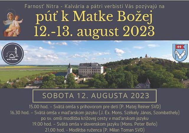 Nitra 9. augusta (TK KBS) Misionári Verbisti a farnosť Nitra – Kalvária pozývajú na výročnú púť k Matke Božej na nitriansku Kalváriu, ktorá bude v dňoch 12. – 13. augusta 2023. Je zabezpečený bohatý program pre deti, mládež i rodiny - pre slovensky i maďarsky hovoriacich pútnikov. Nedeľnú slávnostnú svätú omšu o 10:00 prinesie v priamom prenose Televízia LUX.