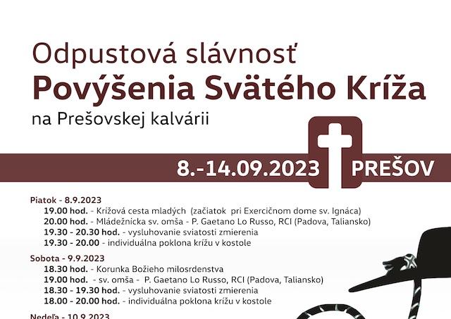 Prešov 17. augusta (TK KBS) Farnosť sv. Mikuláša v Prešove chystá odpustovú slávnosť Povýšenia Svätého Kríža na prešovskej Kalvárii. Uskutoční sa v dňoch 8. - 14. septembra 2023, informoval TK KBS Michal Škulka.
