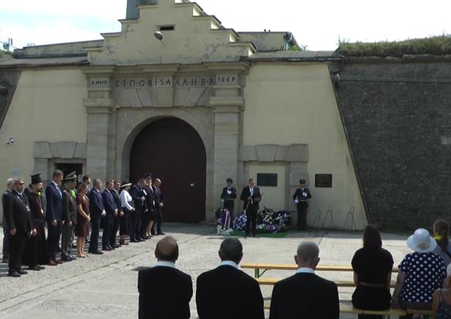 Oficiálna pietna spomienka pri pamätnej tabuli pred bránou ÚVTOS a ÚVV Leopoldov sa začala kladením vencov a štátnou hymnou SR.
