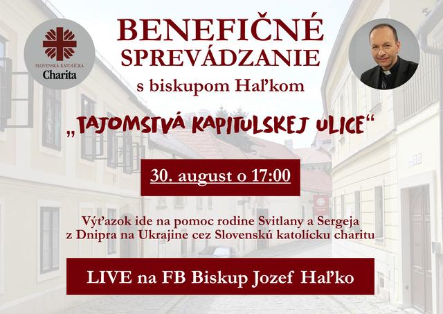 Bratislava 25. augusta (TK KBS) Slovenská katolícka charita pozýva spolu s biskupom Jozefom Haľkom k adresnej pomoci rodine v ukrajinskom Dnipre. Pomôcť môžete počas benefičného sprevádzania s názvom „Tajomstvá Kapitulskej ulice“. Sprevádzanie bude LIVE na facebookovej stránke Biskup Jozef Haľko 30. augusta a začína sa o 17.00 hod.