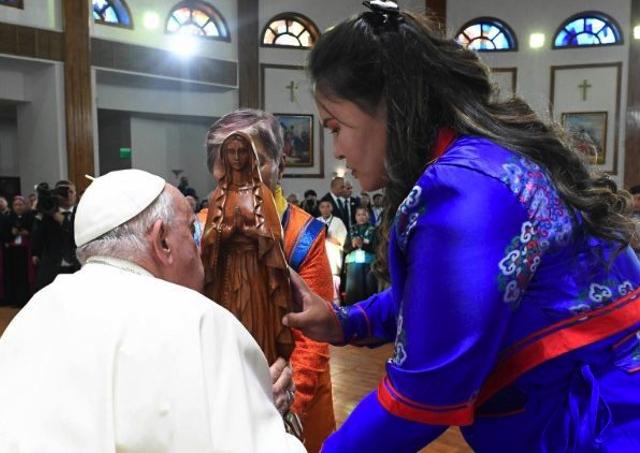Skutočnosť, že váš biskup je kardinál, je ďalším prejavom blízkosti: vy všetci ste vzdialení len fyzicky, ale ste veľmi blízko Petrovmu srdcu. Celá Cirkev je blízko vám, vášmu spoločenstvu, ktoré je skutočne katolícke, to znamená univerzálne, a priťahuje sympatie všetkých bratov a sestier roztrúsených po celom svete smerom k Mongolsku, veľkému cirkevnému spoločenstvu.