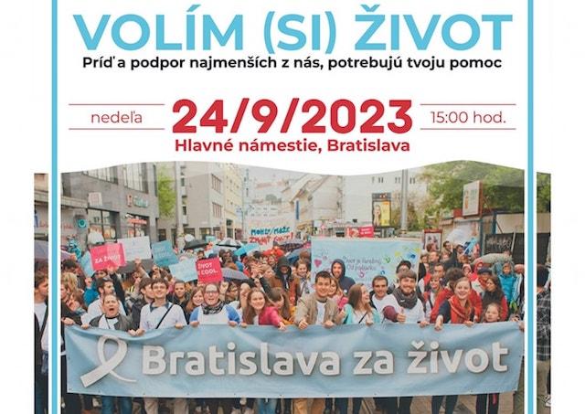 Bratislava 12. septembra (TK KBS) Na Hlavnom námestí v Bratislave sa v nedeľu 24. septembra 2023 o 15:00 uskutoční pochod Bratislava za život. Cieľom pochodu je osláviť život a zároveň apelovať na ukončenie diskriminácie nenarodených detí. Hlavným mottom tohto ročníka je heslo „Volím (si) život“. Hlavnými organizátormi sú Inštitút Ladislava Hanusa, Inštitút pre ľudské práva a rodinnú politiku a Asociácia za život a rodinu. Záštitu nad podujatím prebrala Bratislavská arcidiecéza.