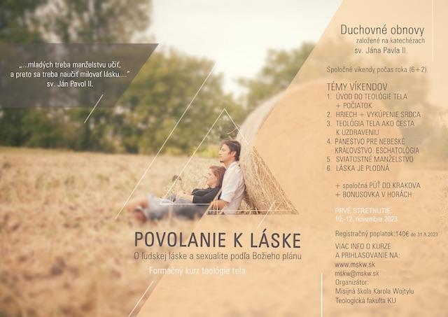 Bratislava 29. septembra (TK KBS) Misijná škola Karola Wojtylu v spolupráci s Teologickou fakultou Katolíckej univerzity v Ružomberku Vás pozývajú na jubilejný X. ročník Formačného kurzu teológie tela Povolanie k láske. Prvý víkend je naplánovaný na 10. – 12. novembra 2023.
