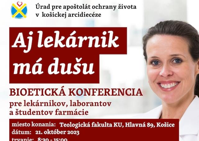 Košice 4. októbra (TK KBS) Úrad pre apoštolát ochrany života v Košickej arcidiecéze pozýva farmaceutov, laborantov i študentov farmácie na 6. ročník bioetickej konferencie „Aj lekárnik má dušu“. Konferencia bude v sobotu 21. októbra 2023 v budove Teologickej fakulty KU v Košiciach.